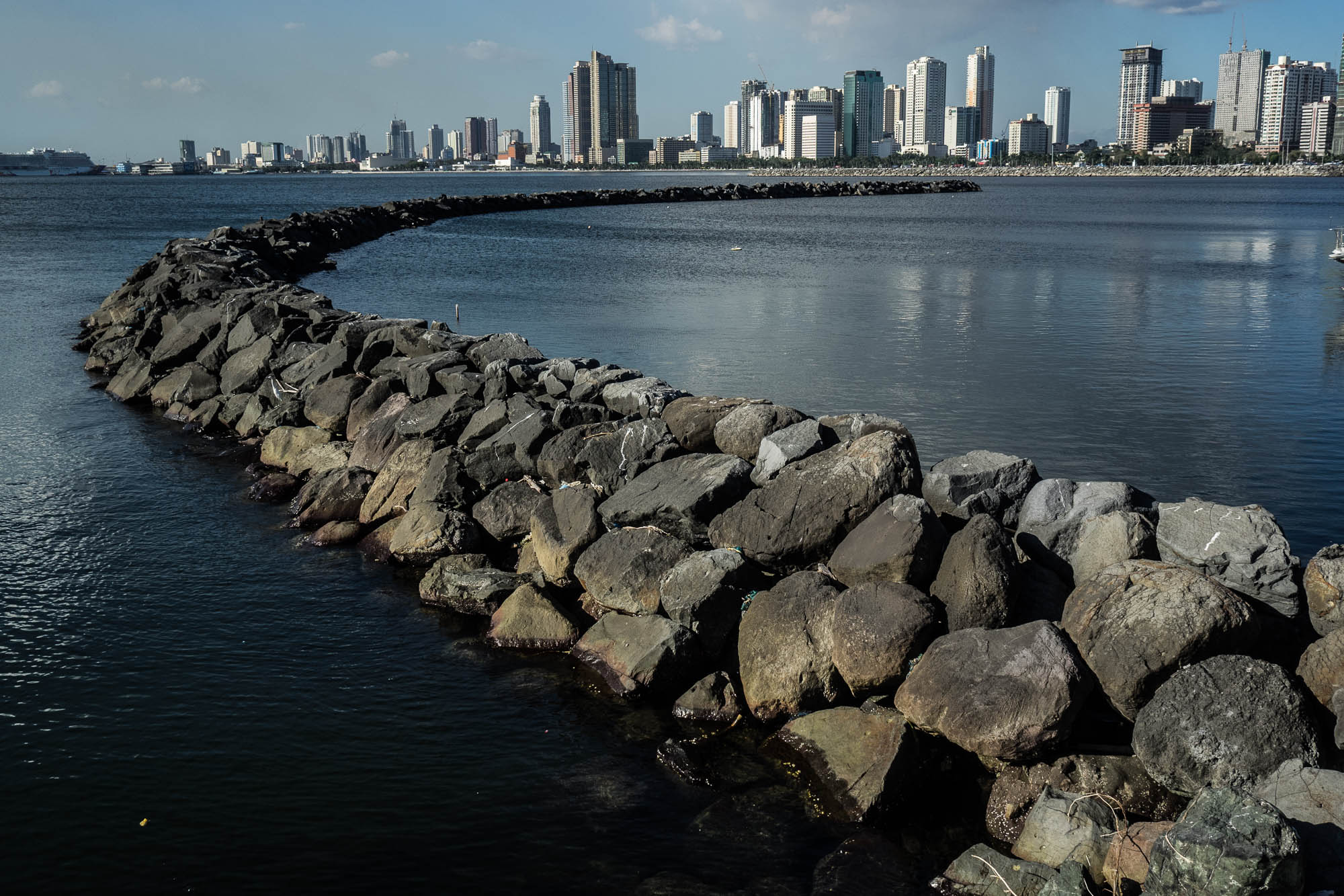 Les digues brise-lame au large de la baie de Manille permettent d’amortir ou briser les fortes vagues avant d’atteindre le littoral. Ces vagues dévastatrices surviennent lors des typhons. Ces digues, s’étalant sur plusieurs kilomètres, parviennent à réduire l’impact des vagues sur le rivage.